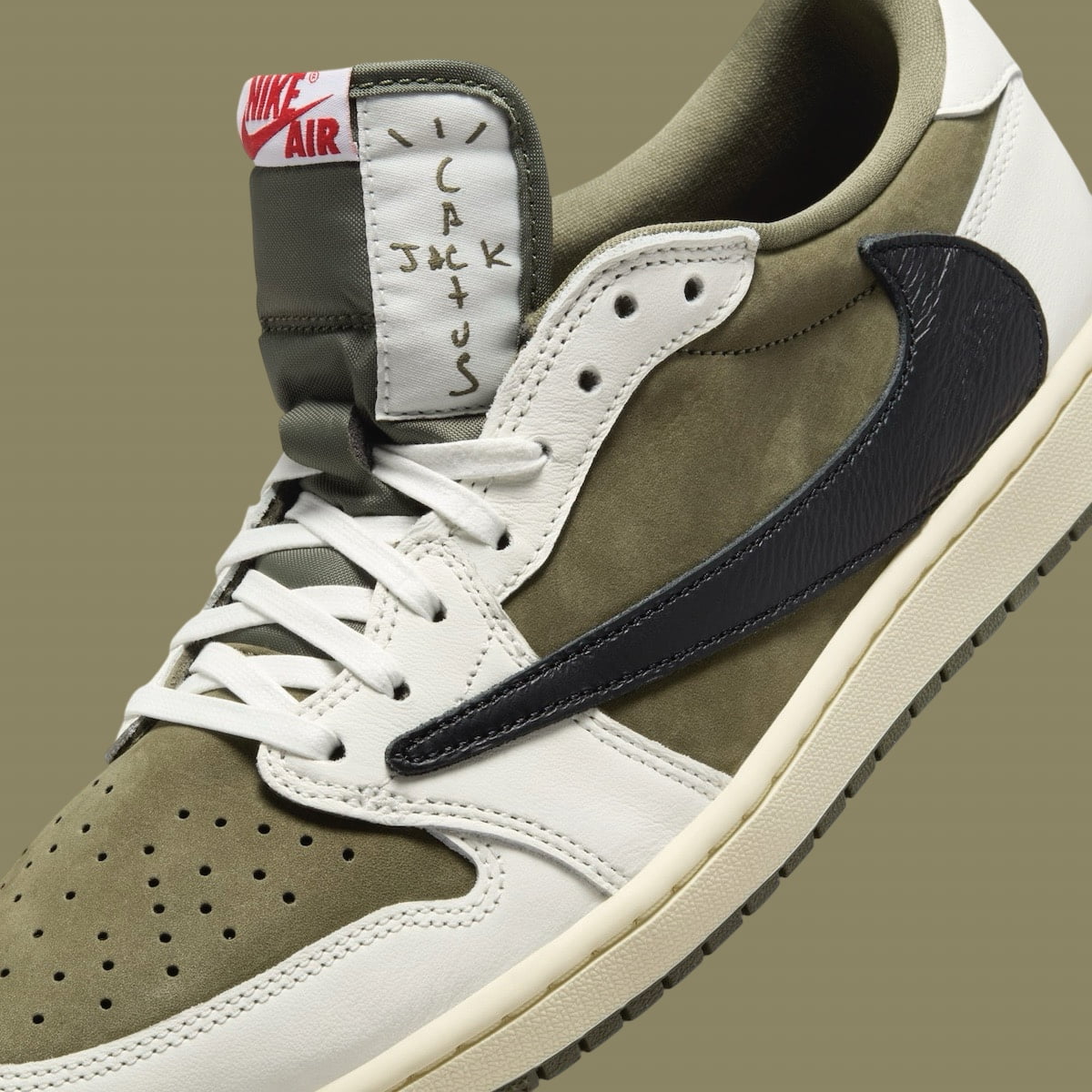 De Travis Scott x Air Jordan 1 Low OG SP ‘Medium Olive’ is zoals iedere Travis Scott release, een gewilde sneaker. Deze exclusieve samenwerking tussen Travis Scott en Jordan komt op 28 september 2024 uit en heeft, zoals veel van Scott’s eerdere designs, een unieke esthetiek. De schoen kenmerkt zich door een olijfgroene suède basis met witte leren overlays. Het meest opvallende element is de omgekeerde zwarte Swoosh op de zijkant, een kenmerkend detail van Travis Scott’s Air Jordan-samenwerkingen.
